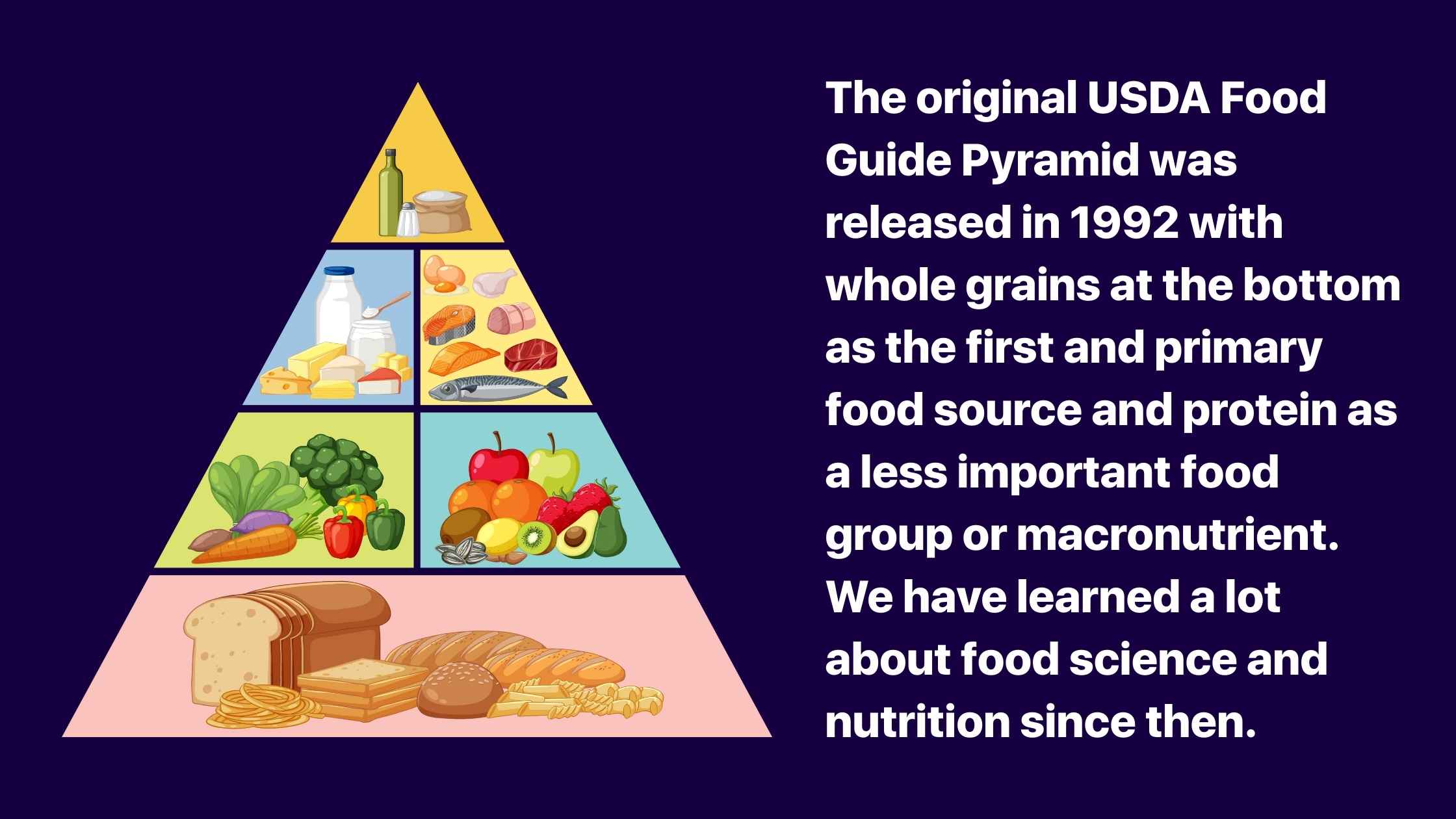 The 1990s food pyramid placed whole grains at the base of the diet, recommending 6–11 servings per day of bread, rice, cereal, and pasta, while protein foods like meat, fish, eggs, beans, and nuts were limited to just 2–3 servings and relegated to the top. In other words, protein wasn’t seen as very important thirty years ago. With the clarity of hindsight and advances in nutrition science, it’s easy to see how lopsided this logic was.